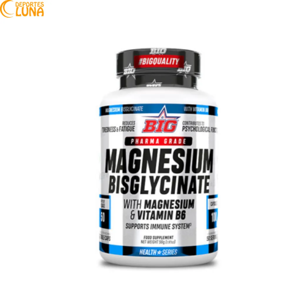Magnesium Bisglycinate 100 Cápsulas BIG, magnesio de alta absorción que reduce la fatiga y mejora el rendimiento muscular. Ideal para deportistas y bienestar diario.